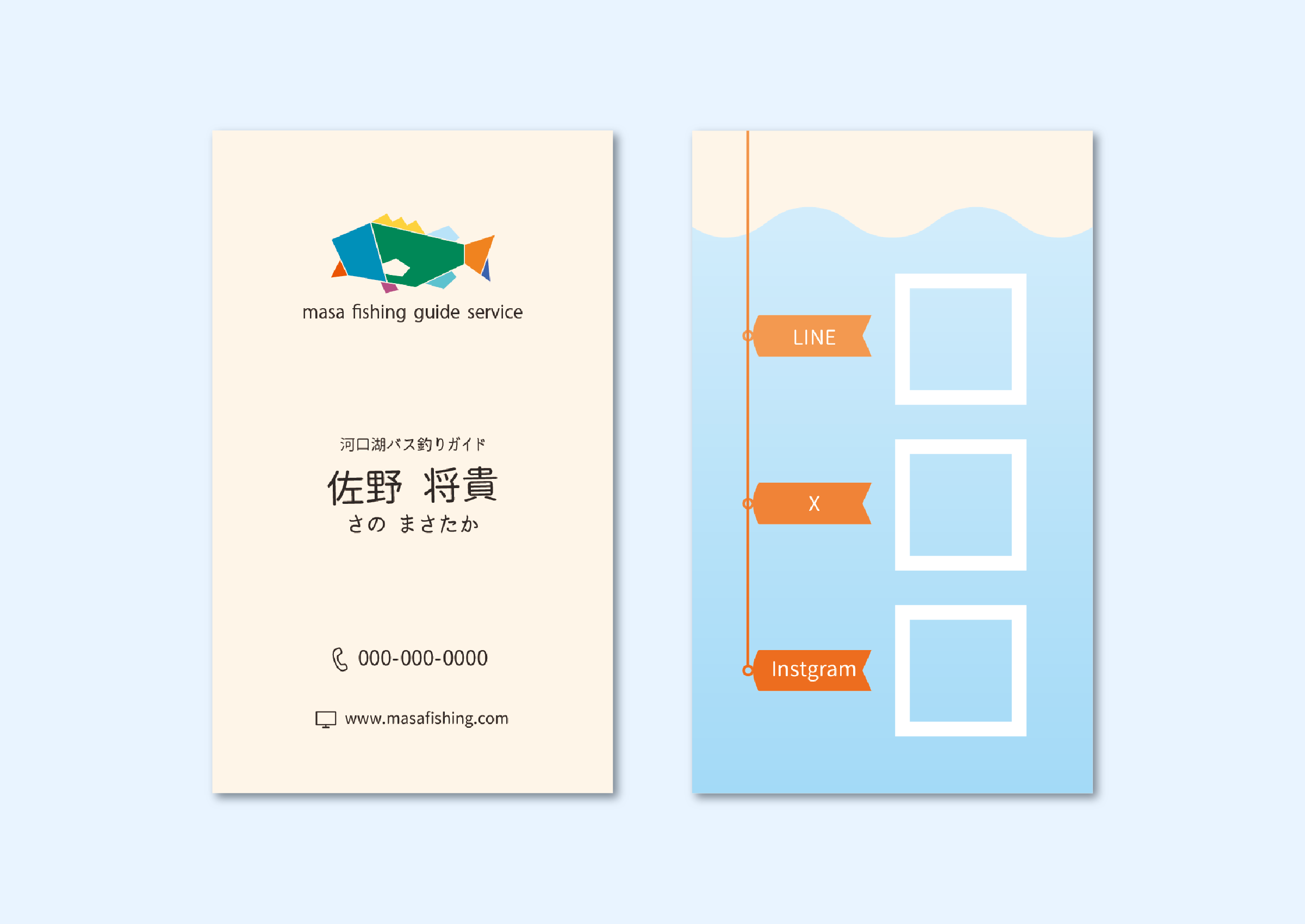 楽しいイメージを持てるデザインにしたいというご要望でしたので、ロゴには彩度の高い色をたくさん使用して、ポップなデザインにしました。また、釣りの要素を入れたいとのことで、裏面のSNSの記載はルアーに見立てて遊び心を追加しました。